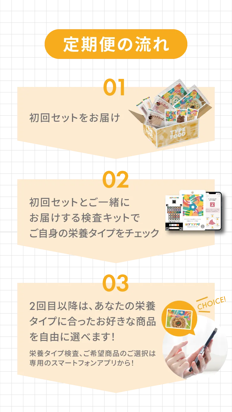 TYPE FOODの定期便では、はじめに商品をご提案します。最終的に購入される商品数はお客様ご自身でお選びいただけます。