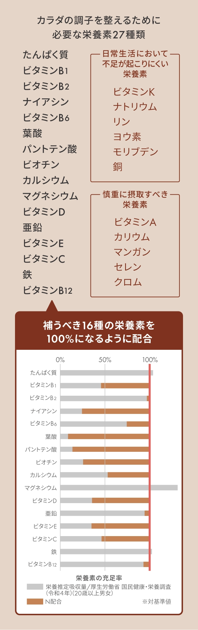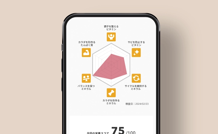 ビタミン・ミネラル・たんぱく質が持つ役割から6つの項目に分け、あなたに足りていない栄養素を分析、評価します。